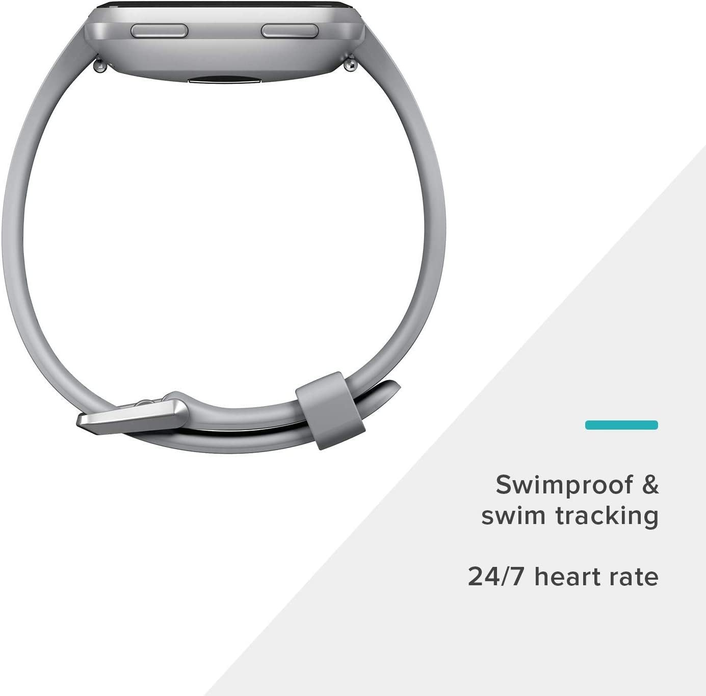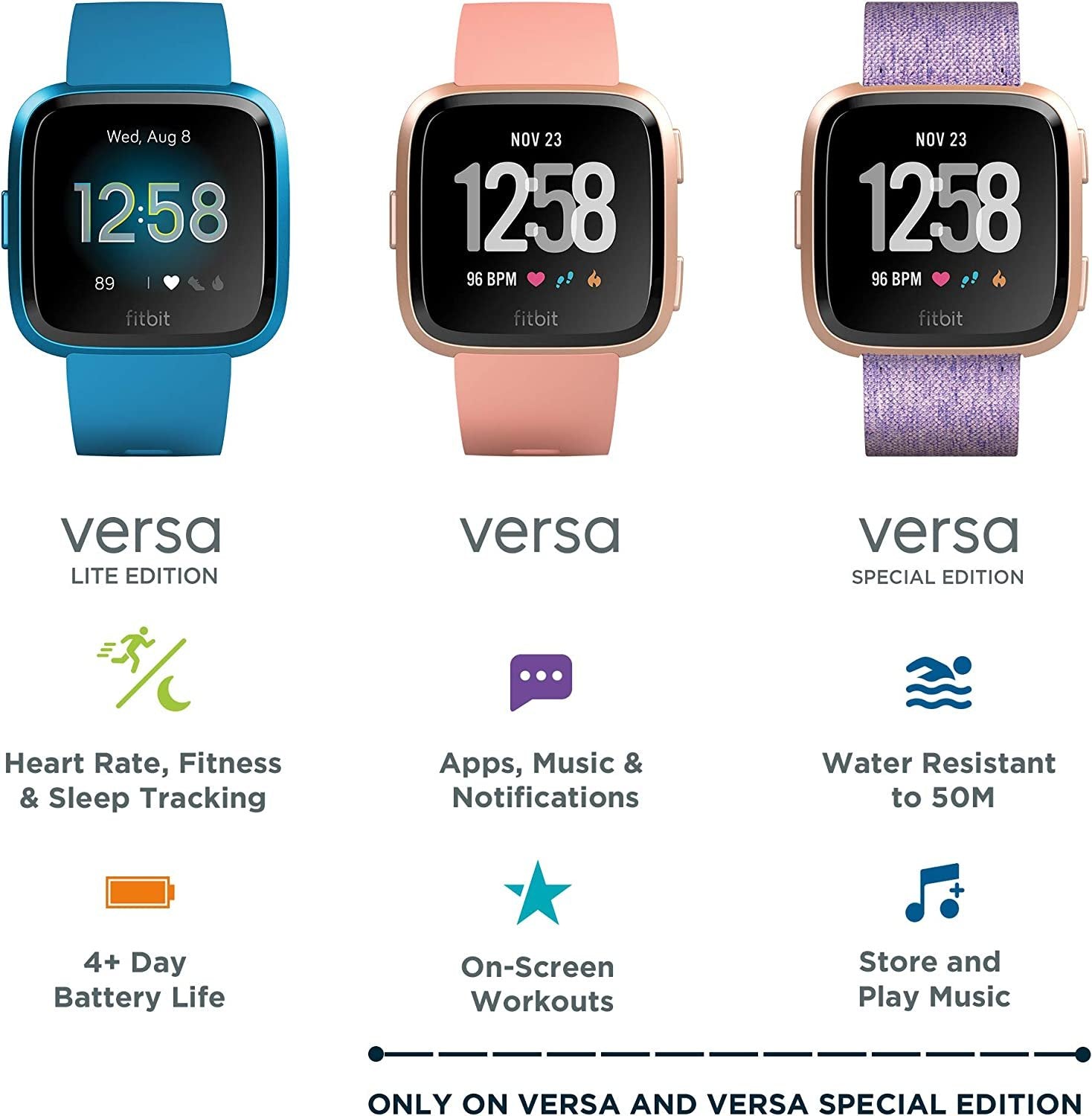 Track your all day Activity, 24/7 heart rate, & sleep stages, all with a 4 plus day battery life (varies with use and other factors) and a slim, comfortable design with a lightweight, anodized aluminum watch body. Syncs with mac OS x 10.6 and up, iPhone 4s and later, iPad 3 gen. And later, android 5.0 and later and windows 10 devices. Syncing range: up to 6.1 meters Use 15 plus exercise modes like run or swim (Fitbit versa is water resistant to 50 meters) to record workouts and connect to smartphone GPS for more precise real time pace & distance Access your favorite apps for sports, weather & more and get call, calendar, text, and app alerts Get call, text, calendar and smartphone app notifications when your phone is nearby. Plus send quick replies on android only Automatically track select sports & workouts with smart-track and use female health tracking in the fitbit app to log periods, symptoms and more Operating temperature: 10° to 60° C